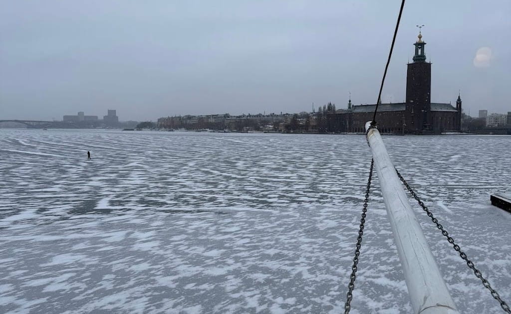 But for now, I'm in my cabin on the Mälardrottningen and the river outside is frozen solid, and from time to time, ice skaters pass under the portholes.